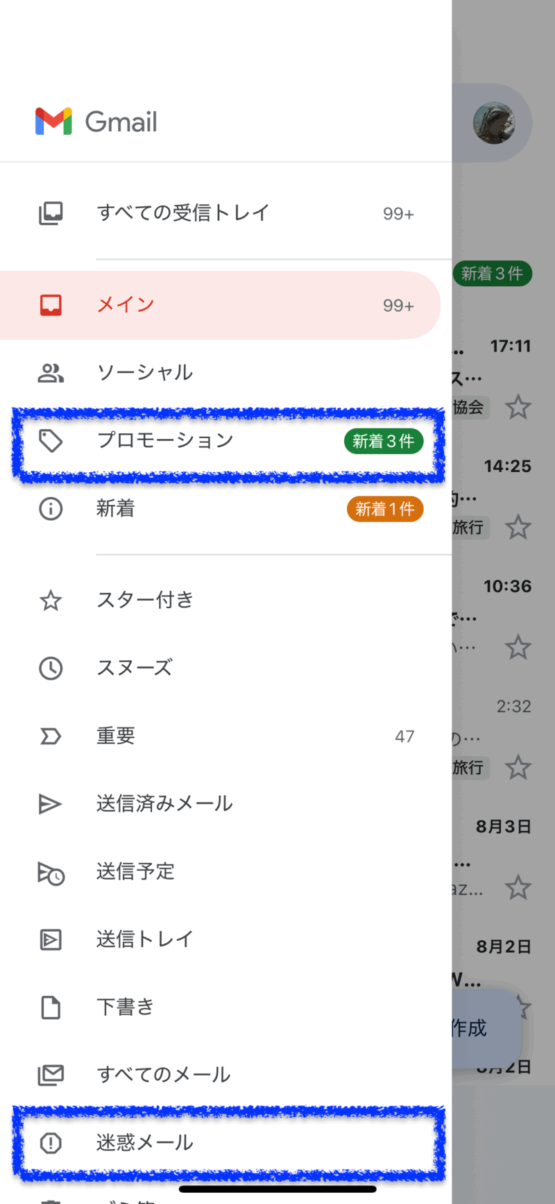 → スマホの場合:Gmailアプリの左上メニューから「迷惑メール」を探してください